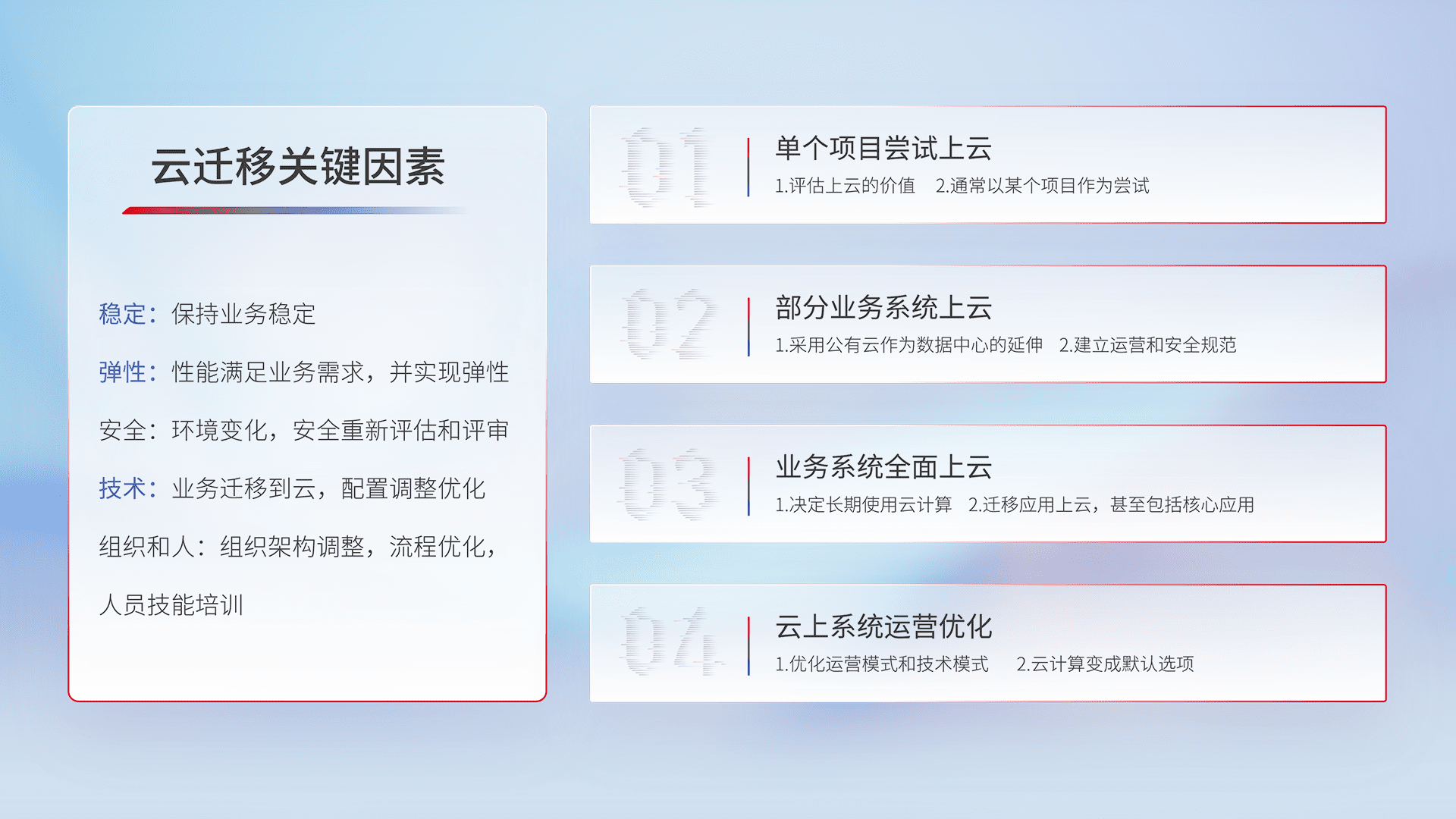 结合实际业务,,,从规划设计、、云平台选型、、、云原生改造、、数据迁移、、、集成交付,,,迁移全过程为客户识别最佳上云路径,,,做好风险识别管理,,,设计网络架构、、、、身份权限、、、、安全审计合规、、操作审计、、、、日志审计、、监控告警策略、、、、多站点容灾设计等,,,,对云上基础设施进行整体规划,,,,提升IT治理水平,,,,以满足弹性、、、、高可用、、高性能的需求。。